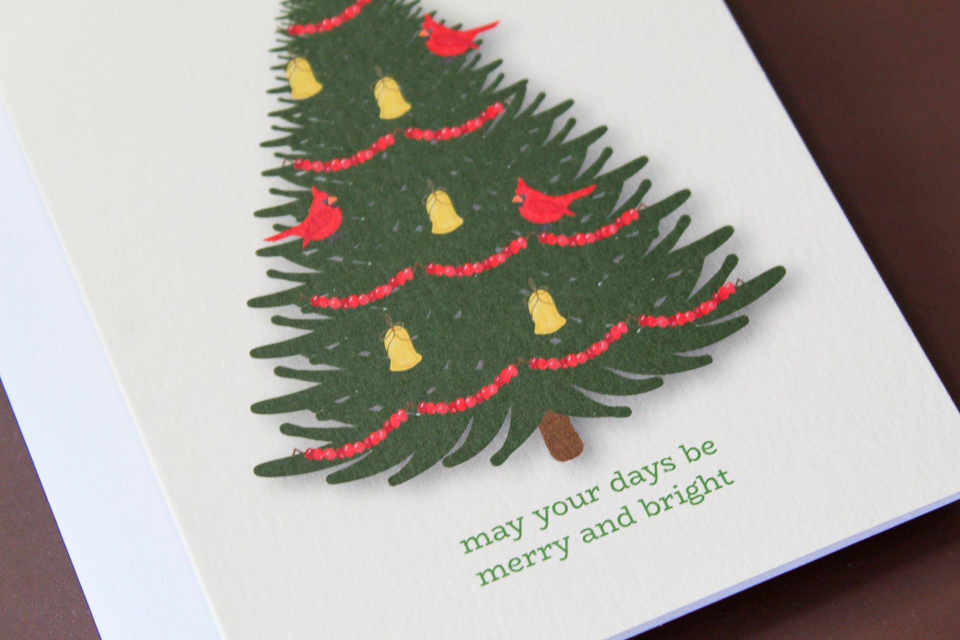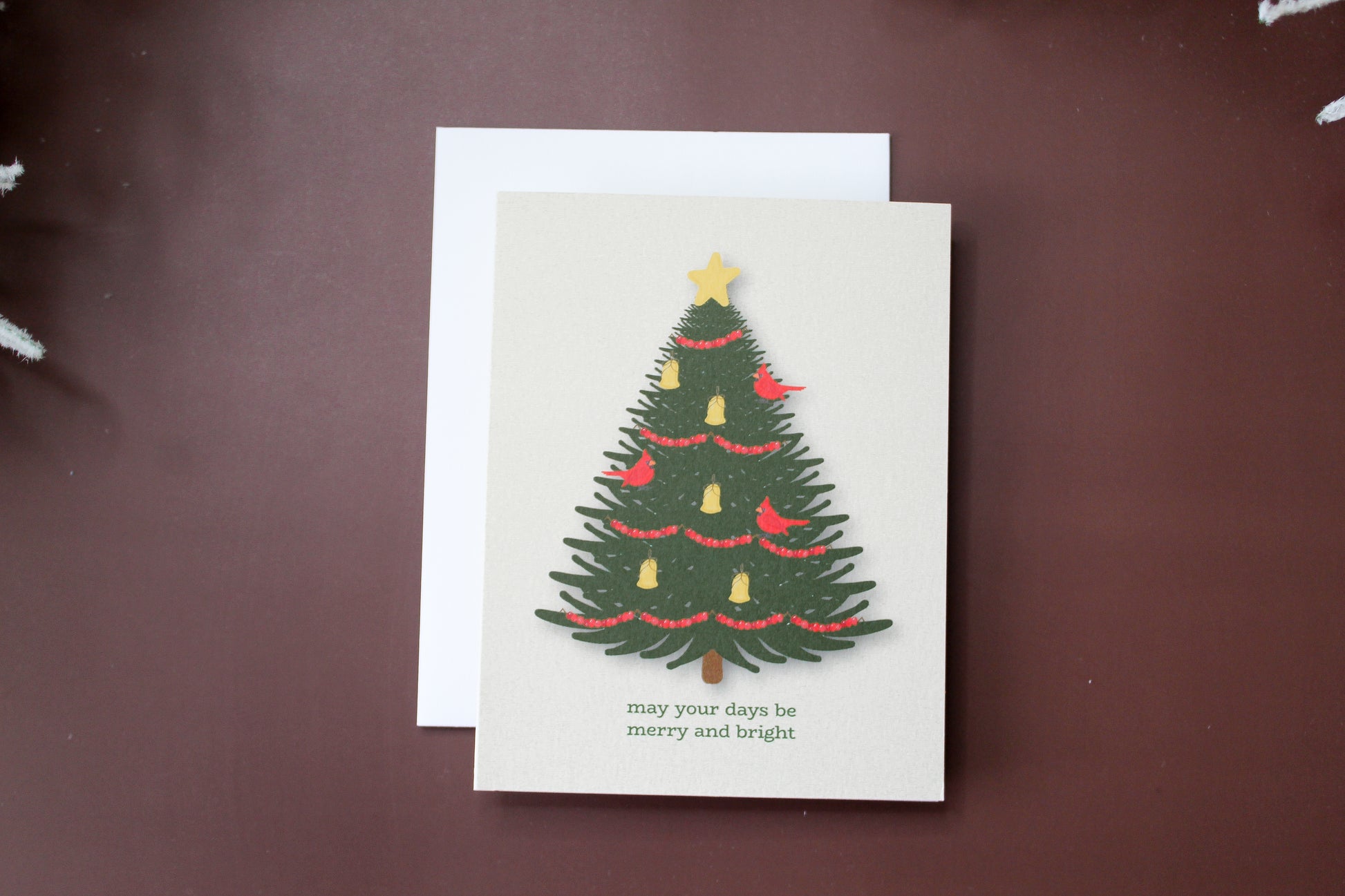 "May Your Days Be Merry and Bright" Christmas Greeting spreads some holiday cheer with an illustrated Christmas Tree decked out with Cardinal Red Birds and bells. Each card is folded to 4.25" tall by 5.5" wide, is blank inside and comes with a matching white envelope. Cards are packaged in cellophane sleeves. Complete the package with our coordinating Gift Tags.