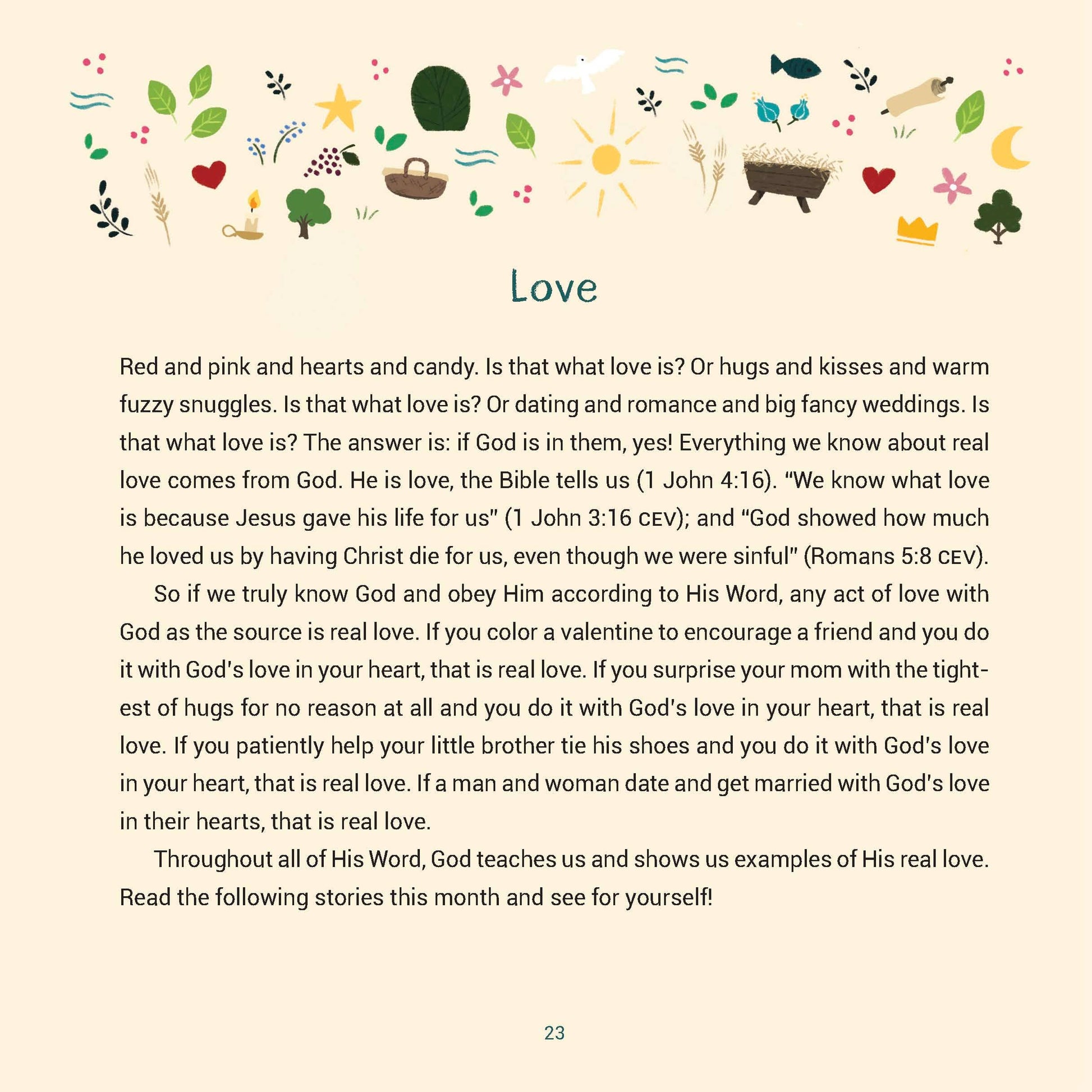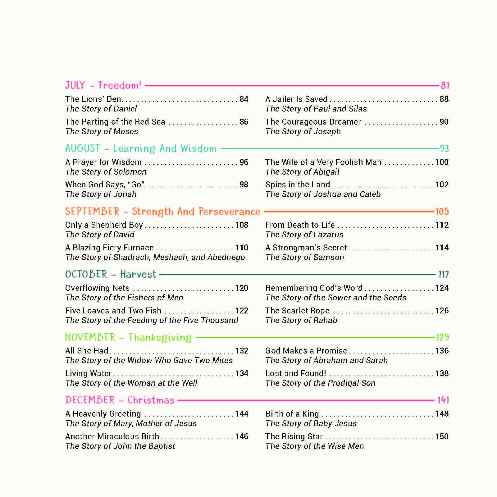 Each section includes 4 colorfully illustrated Bible stories that reinforce the monthly theme and show kids how God worked in the lives of Bible men and women--and how He works in the lives of people today!