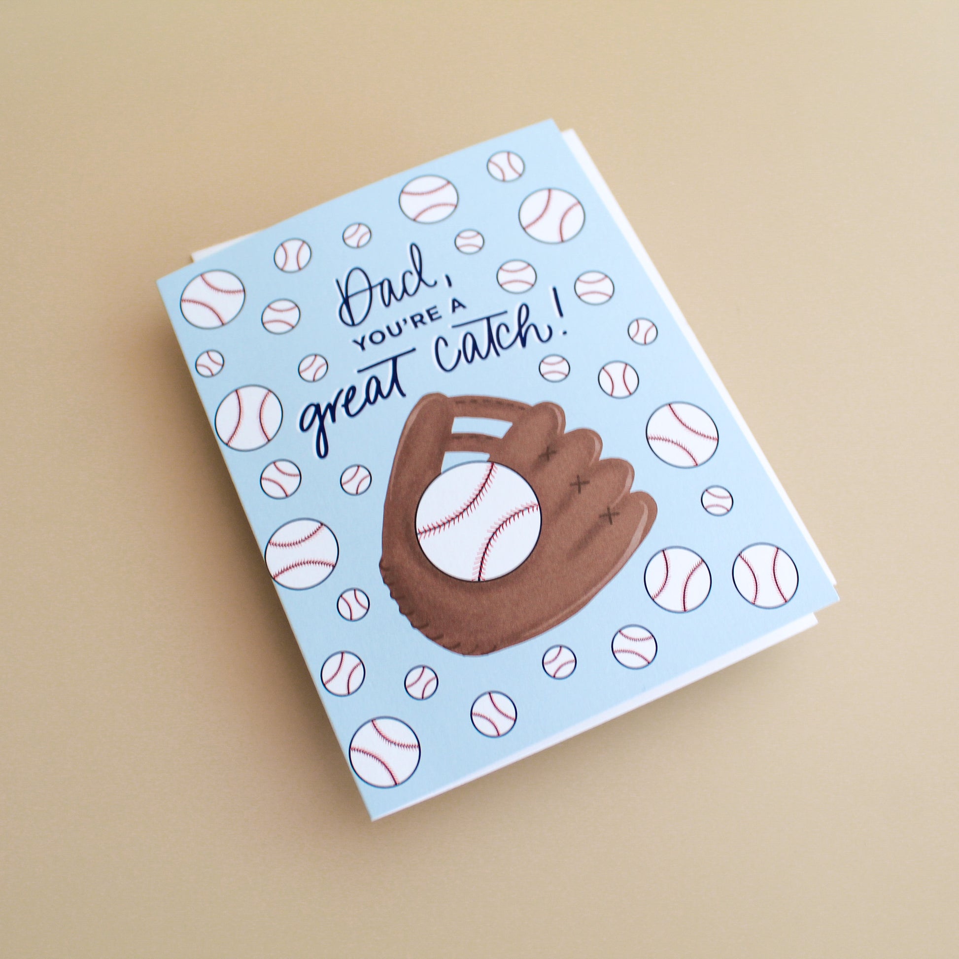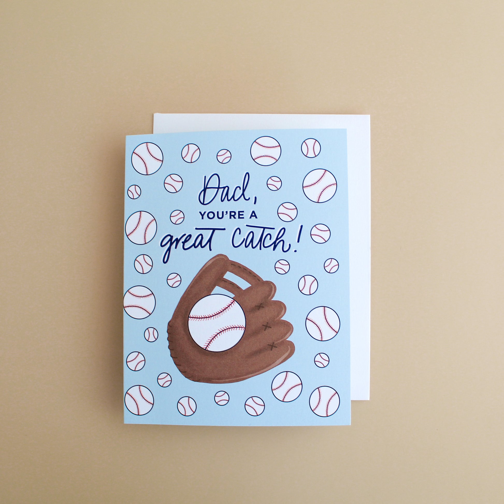 Score a home run with this baseball-themed Father's Day card! Featuring the pun-tastic phrase, "Dad, you're a Great Catch!," this card is the perfect way to show your love and appreciation for the Dads in your life.