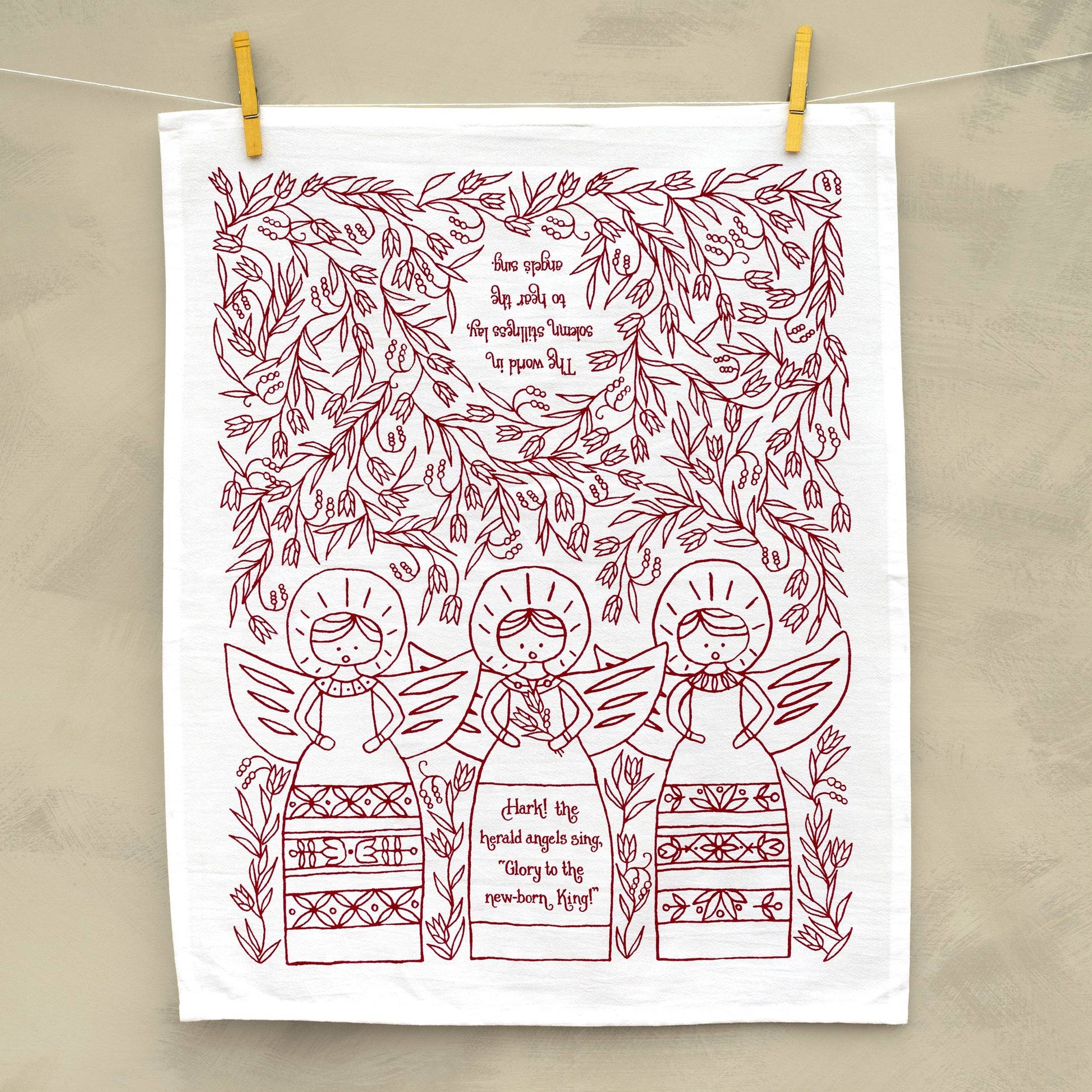 This delightful tea towel celebrates the season and makes a bright and cheerful addition to your kitchen. Use for drying hands and dishes, cleaning up spills, wiping countertops, lining baskets, or brightening up your home with color and song. Hang on the oven, or frame and display on the wall. The Hark! The Herald Angels Sing hymn tea towel is printed in festive cranberry and features lyrics from the hymn along with floral illustrations and our trio of caroling angels. Made of 100% cotton, these flour sack tea towels easily and cost-effectively replace disposable paper towels with high absorbency and durability. Generousl