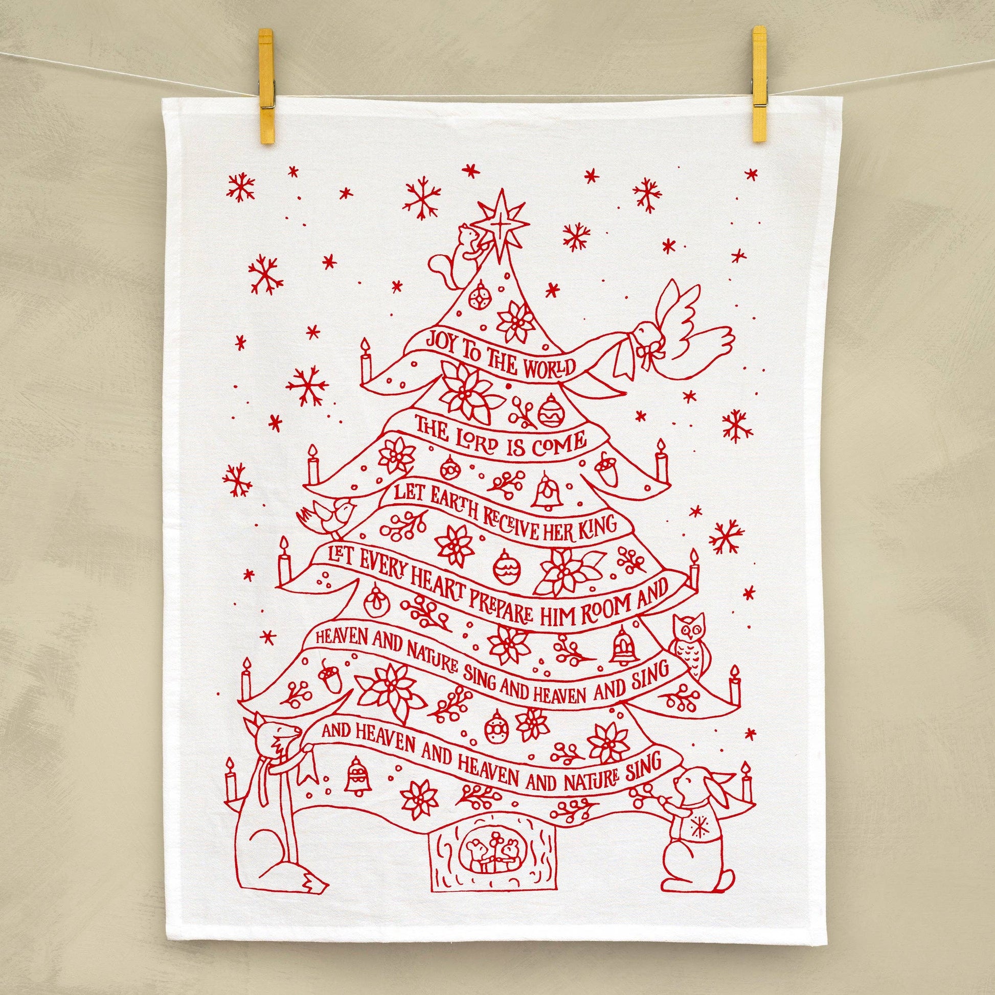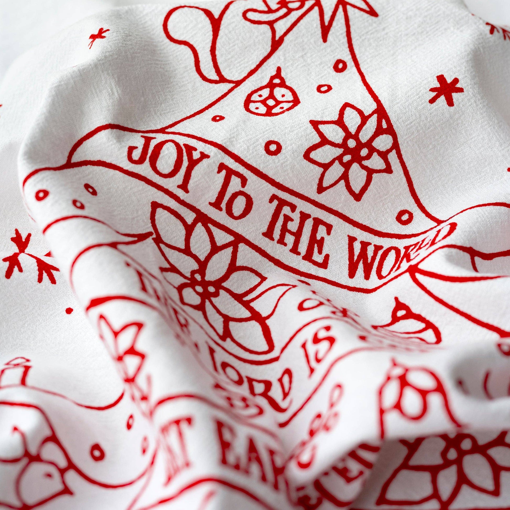 This festive tea towel celebrates the season and makes a bright and cheerful addition to your kitchen. Use for drying hands and dishes, cleaning up spills, wiping countertops, lining baskets, or brightening up your home with color and song. Hang on the oven, or frame and display on the wall. The new Joy to the World hymn tea towel is printed in winter ivy and features beautifully printed, hand-lettered lyrics from the hymn. Made of 100% cotton, these flour sack tea towels easily and cost-effectively replace disposable paper towels with high absorbency and durability. Perfectly sized, lint free, and made to last a lifetime. Illustrated by Kate Whitley.