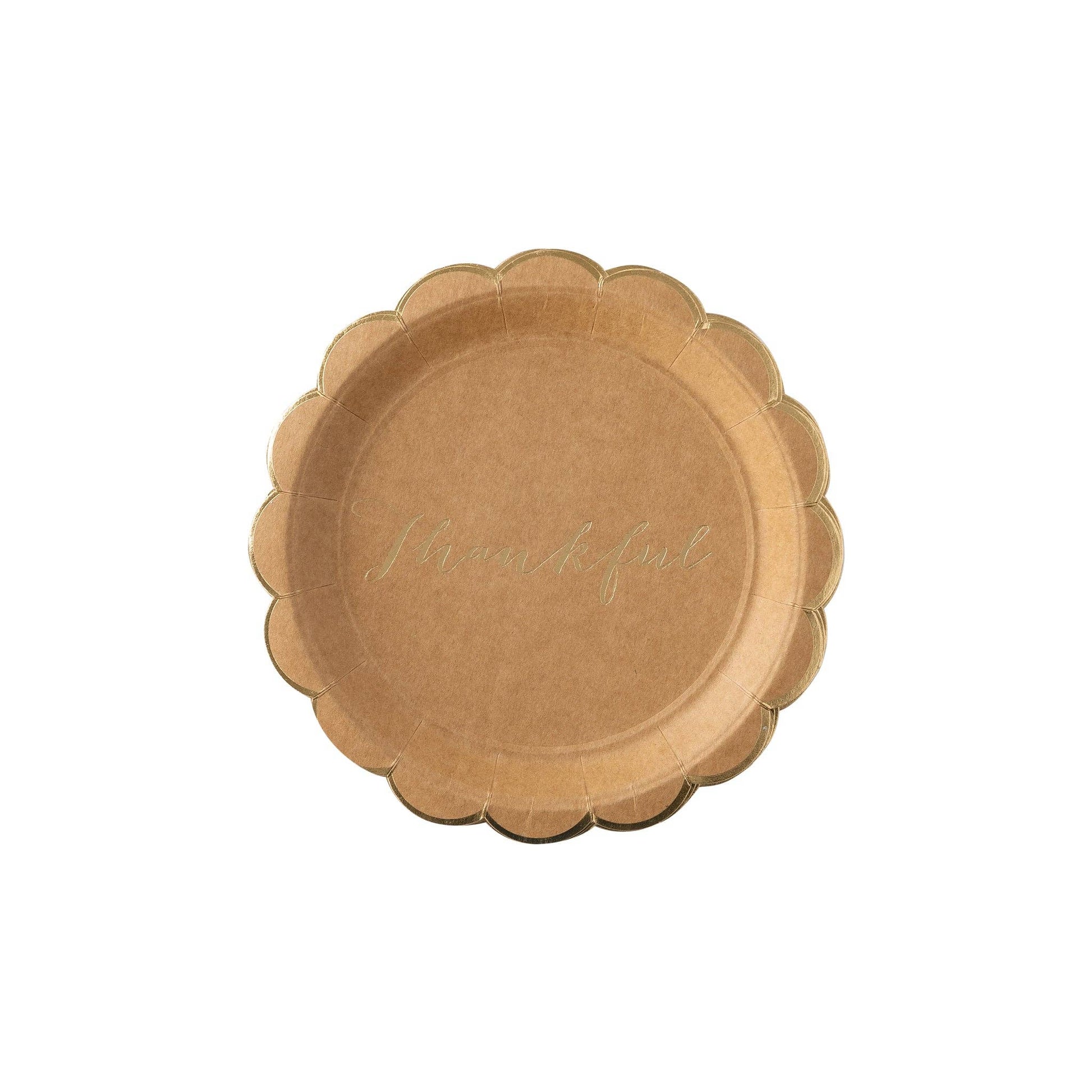 Simple yet stunning, these party plates are sure to make a statement at your Thanksgiving table this year. Designed with rustic kraft paper with gold foil scalloped edge and "thankful" in foil these paper plates are the perfect addition to your table for your harvest time gatherings!