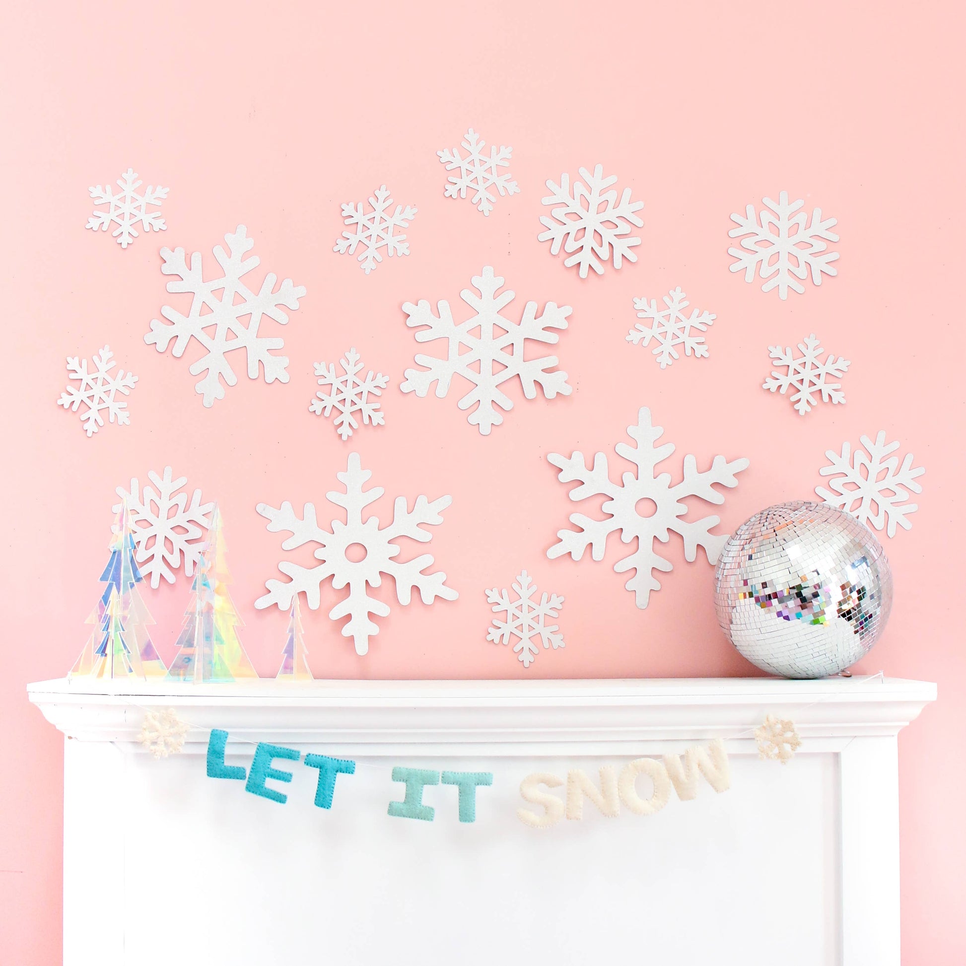 Set of 9 large snowflakes with double sided mounting tape to hang up for your colorful holiday decor. Comes in a clear bag with front header card. Snowflakes measure 6” to 18” in size.